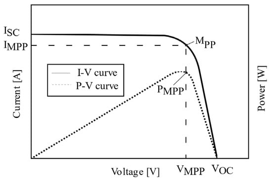 The best-known way to characterize a PV cell or module is to obtain its response curve, which gives voltage, current, and power information. These device responses are known as the I–V curve and the P–V curves, as shown in Figure 2. These characteristic curves provide important information about the state of the PV cell or module under analysis and are directly dependent on the temperature and radiation received by the module or cell.