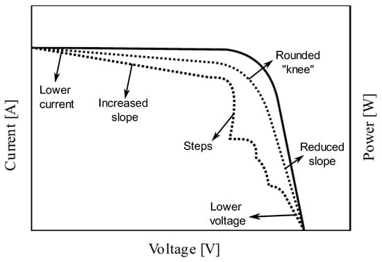 Common deviations of an I–V curve in a PV generator in deterioration mode. Source [12], own elaboration.