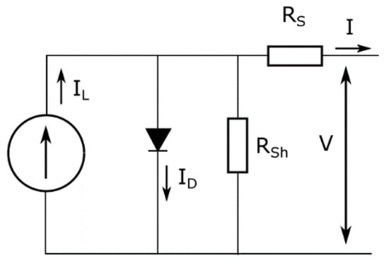 Like any electrical generator, a PV module or cell can be modeled using its electrical characteristics, considering that this model must predict the electrical output of the cell under different types of operating conditions. Numerous models have been made in order to simulate the performance of solar cells [13]. The single-diode model is the most widely used. Three equivalent circuit models can be used to describe a single-diode model. The first of them is the ideal solar cell, also called 1M3P model (Single Mechanism, Three Parameters). For an ideal model, a solar cell can be simply modelled by a p-n junction in parallel with a current source that is associated to the photo carriers generated. The three parameters are the illumination current associated to the photoelectric effect, IL, the reverse bias saturation current for the diode, I0, and n, the diode ideality factor. More accuracy can be introduced to the model by adding a series resistance. The solar cell with series resistance, commonly known as 1M4P model (Single Mechanism, Four Parameters), takes into account the influence of contacts by means of a series resistance RS. The unknown parameters of this model are: IL, I0, n, and RS. These models are not accurate enough, as they do not take into account some real factors in the solar cells. For that, it is necessary to introduce one more precise and realistic solar cell model. It is the solar cell with series and shunt resistances, 1M5P model (Single Mechanism, Five Parameters), shown in Figure 4. The RSh, parallel shunt resistor takes into account the leakage currents. The five parameters of this model are: IL, I0, n, RS, and RSh [13]. The commonly used model is the one that represents the cell as a diode in parallel with a current source dependent on solar radiation [14] as shown in Figure 5, where the current delivered by the IL PV generator is proportional to the solar radiation minus the currents flowing through the ID diode and the RSH parallel resistance.