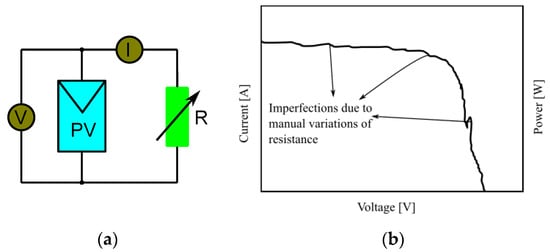 Schematic of a variable resistor tracer: (a) connection scheme. Source [16], own elaboration; (b) I–V curve obtained with a variable resistor tracer. Source [17], own elaboration.