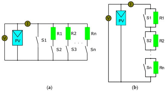 To improve the quality of the curve, in [21,22,23,24], diagrams of multiple resistors controlled by switches are presented to obtain the I–V curve (Figure 7), where its main limitation is the number of steps or points that can be obtained. In [21], a current and voltage sequencer is proposed, through the connection of resistors in parallel, automated by a computer, where the resistances must be selected appropriately to obtain a well-defined “knee”. In [22], a similar methodology is proposed, with the difference that the switches are MOSFETs, and the interface with the computer is an Arduino with a 12-bit external ADC. To increase the number of steps of this type of tracer, in [23], a binary scheme is proposed, where the resistors are in series and their activation depends on normally closed relays. Thus, in the case of a tracer with eight resistors, 255 different resistance values could be obtained for the elaboration of the I–V curve. In [24], LabView is used to capture the curve and carry out previous analyses.