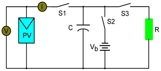 In Figure 8, the schematic of a capacitive tracer is shown, where before the measurement, the capacitor begins unloaded by S3 and R. When the measurement is to be started, S3 opens and S1 closes, so the PV generator has a very low load, reaching short-circuit condition. As the capacitor charges, the current decreases and the voltage increases, so when the charge ends, the current delivered by the module becomes zero, reaching the open-circuit condition. This scheme also allows starting the measurement with S2 closed, so that the capacitor would be charged to a negative voltage to reach Isc exactly.