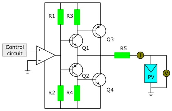 It is a type of tracer that uses a configuration of bipolar transistors as class B power amplifiers (Figure 13) to allow the reversal of current and voltage for measurement of “dark” I–V curves (simulation of an I–V curve of a module in conditions without lighting). In [42], this type of tracer is used as a reference for the design of a solar simulator.