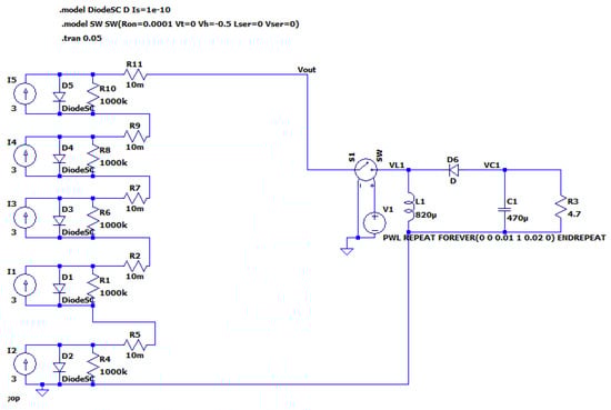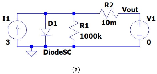 The equivalent circuit shown can be used as a single cell, a multi-cell module, or an array of multiple modules. Considering temperature and constant radiation, the characteristic I–V of the 1M5P model is expressed by Equations (1) and (2):
