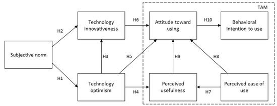 We focus on theoretical constructs proposed by Davis [17] in the TAM: perceived ease of use, perceived usefulness, attitude toward using, and behavioral intention to use. Further, the TAM uses two theoretical constructs proposed by Parasuraman [37], technology optimism and technology innovativeness, in addition to the subjective norm, because they are related to behavioral intention to use.