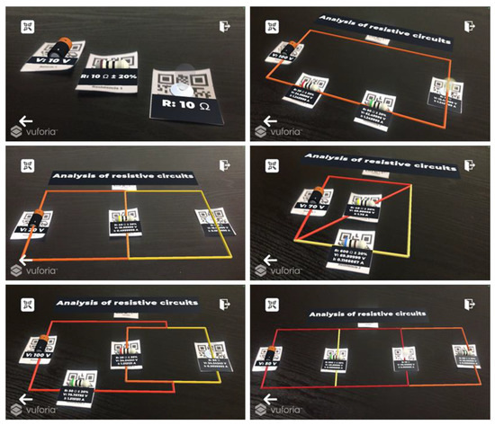 Some apps have been developed as a support for learning electrical circuits, which help visualize electricity. Matcha and Rambli [10] developed a prototype to analyze the relationship between current and resistance in a circuit. Restivo et al. [11] developed the app “CD Circuit Puzzle.” The circuit elements were used as Lego pieces to understand their operation, perceive different situations, and practice solutions. However, these apps only reach a medium degree of interaction (level III, complex interaction: the student can manipulate graphical objects to analyze their behavior [52]). Therefore, we developed an AR app that reaches a high of interactivity (level IV, real-time interaction: the student can interact in a simulation where stimuli generate complex responses [52]). This app, named “INGAR DC Analysis,” analyzes direct current (DC) in resistive circuits. This app allows the user to change the batteries’ voltage values and the resistance value of the light bulbs and resistors under controlled safety conditions, generating real-time amperage calculations present in the circuit.