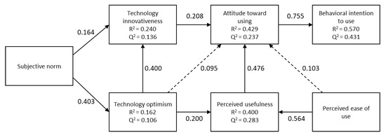 Technology optimism has an indirect effect on attitude toward using, which is caused by the moderation of technology innovativeness (0.400 × 0.208 = 0.083) and perceived usefulness (0.200 × 0.476 = 0.095), although both these effects are negligible.