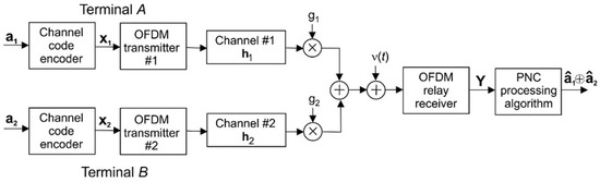 For the sake of simplicity, we assume that the channel impulse responses have unit energy, and we model the unequal power of the signals reaching the relay using the weighting coefficients and To model the propagation loss, we assign the power (i = 1, 2) of signals incoming to the receiver from each user by setting the values of the coefficients The received signal is disturbed by the additive white Gaussian noise ν(t). In this paper, we assume that signals from both transmitters arrive at the receiver with such a propagation delay difference that the receiver can select a common orthogonality period in which OFDM signals from both transmitters are analyzed. Typically, e.g., in device-to-device (D2D) or WiFi communications, distances between transmitters and receivers are not large (e.g., up to a few hundred meters), so a coarse synchronization of both transmitters justifies such an assumption. The relay receives the noisy version of the summed signals and derives the sample block Y which constitutes the subcarrier outputs of the OFDM correlator. Next, the PNC processing algorithm derives the data block which will be transmitted by the relay OFDM transmitter in the broadcast phase to both terminals A and B.