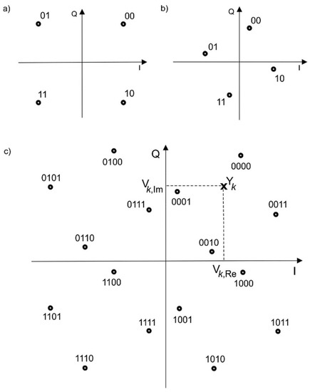 Now, a unique mapping of constellation points, , and bit blocks has to be set. Out of many possible mappings, we can select the one for which the first p bits are the same as in the constellation of , participating in the creation of a particular , and the remaining q bits are the same as in the mapping for participating in that as well.