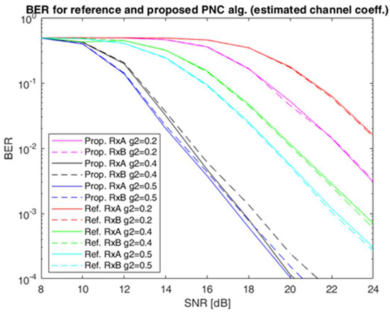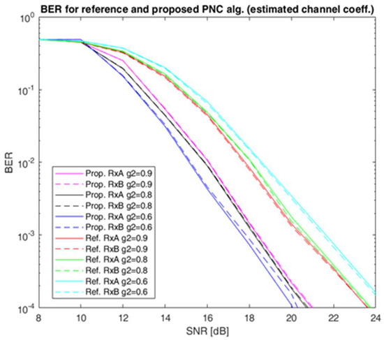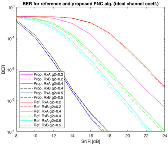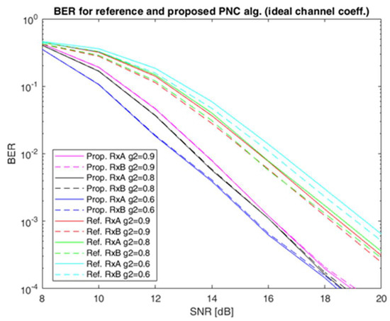 Similar conclusions can be drawn based on Figure 7, in which the plots for the values of g2 between 0.5 and 0.2 are drawn. The worst performance for both types of PNC algorithm occurs for however, the proposed PNC algorithm is about 2 dB better than the reference one. One can also notice that for , the difference in performance is much more significant and is equal to about 5.5 dB.