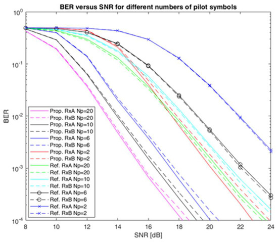 As we can see in Figure 8, the difference in the required SNR for BER = 10−3 between the standard procedure and the application of (9 additional pairs of pilot OFDM symbols) is very high and reaches about 6 dB for the proposed PNC algorithm, and is even higher for the reference one. As such, a large additional pilot load seems to be too high. In the following experiments we selected a compromise value of