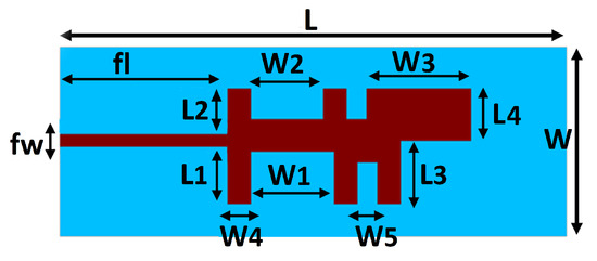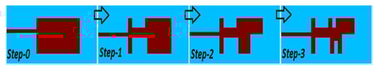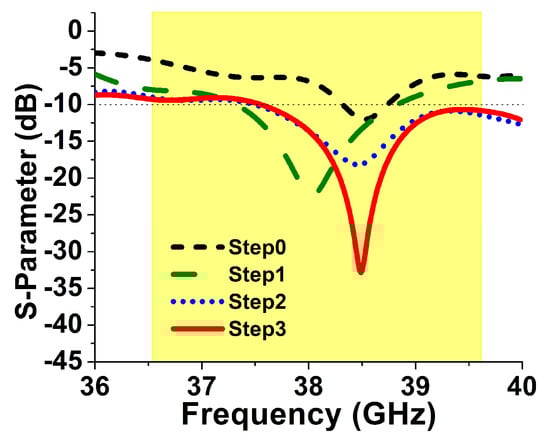 The radiating patch is the modified version of the rectangular microstrip patch antenna as shown in Figure 2. The modifications were performed by introducing the slots in the radiating patch such that it adopts the HP shape. To obtain the resonant frequency in the range of 37–40 GHz (mm-wave 5G band), the dimension of the slots within the radiating patch of the intended design are wisely taken after a three steps design appraisal process as shown in Figure 2. In Figure 3, the reflection coefficients of the design steps are compared. In Step 0, without any modification in the rectangular patch, a non-satisfactory −10 dB bandwidth is observed at the desired frequency band. However, the successive improvements in the scattering parameter (reflection coefficient) and −10 dB bandwidth are perceived in Step 1 by introducing the H-shaped slot. As in Step 0 and 1, the improvement in the reflection coefficient magnitude or bandwidth was observed by varying the feeding position and slots insertion, respectively. While in Step 2 and 3, the feed position was maintained as the same, whereas slots insertion helps to improve the bandwidth and reflection coefficient magnitude, jointly. As in Step 2, P-shaped slot insertion shifts the resonant frequency due to the decrease in electrical length of the radiating element and yields a wideband response ranging from 37.5 to 40 GHz, while the further two slots’ insertion in the middle of H and P-shaped structure improve the S from −18 to −33 dB in Step 3. The modifications (Step 1–3) in the rectangular patch evidence that they are strongly responsible in making their proposed antenna operating with a satisfactory bandwidth at the desired 38.51 GHz frequency band.