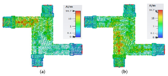 Figure 5 shows the current distribution of the quad-port MIMO antenna at each port consecutively. It can be seen that the current is primarily intense at the edges of the HP-shaped portions of the radiating structure, which means that these are contributing the most to making the proposed structure resonate at the desired frequency band. Furthermore, the feedline of each antenna element holds a high current density. In addition, the coupling current was insignificant among the antenna elements due to their arrangement with a 90-degree phase difference and the anti-parallel position of a diagonal elements.