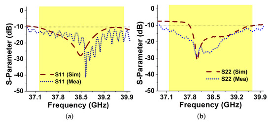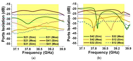 In Figure 7, a comparison between the measured and simulated reflection coefficient was presented. Because of the unavoidable use of cables throughout measurements and fabrication, losses may cause minor deviation in the resonant frequency, while the overall good resemblance of measured results with the simulated one is achieved. While the minor jumps in the port-1 S-parameter are observed due to the cable improper attachment with the connector by the tester while measurement. However, the measured bandwidth for both the antenna elements, i.e., one and two (P1 and P2) of the proposed MIMO system ranges from 36.86 to 40.0 GHz. Due to the symmetrical property, the reflection coefficient measurement is considered only across P1 and P2. Moreover, the isolation achieved was also greater than −25 dB among the antenna elements within the operating bandwidth—as shown in Figure 8.