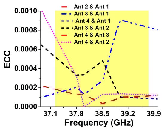 As the MIMO system is a combination of multiple antenna elements, mutual coupling analysis becomes important due to the placement of antennas in close proximity to one another. For this reason, in Figure 11, envelope correlation coefficient (ECC) being one of the key performance measures is analyzed. The lower value of ECC indicates a low mutual coupling and vice versa. The far-field formulation is used to compute the ECC for the proposed MIMO antenna system, given in [25]. Figure 11 illustrates ECC curves for the MIMO antenna which demonstrates the EEC value below 0.001 (<0.5 practical standard) for the desired operating frequency band; ensuring independent channel operation and optimal diversity performance.
