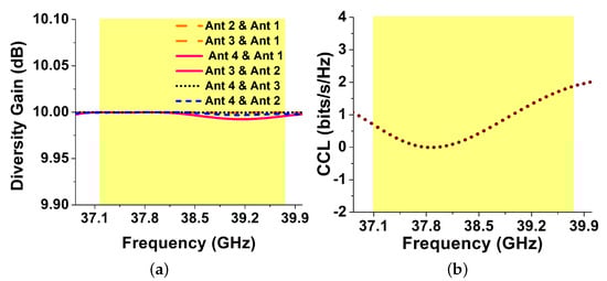 Similarly, another key performance metric is diversity gain, which illustrates the amount of reduction in transmission power after the use of a diversity scheme without a performance loss for the MIMO antennas [26]. Figure 12a shows the diversity gain obtained for the proposed MIMO antenna. The value was found close to 10 dB (ideal value) across the desired frequency band due to the low ECC as shown in Figure 11. Likewise, another important factor in MIMO systems is channel capacity loss (CCL) which describes a loss in MIMO capacity due to the correlation in MIMO links [26]. Figure 12b shows a CCL for the MIMO antenna which is observed during the operating bandwidth (36.83–40.0 GHz) to be less than 0.6 bits/s/Hz, revealing the high throughput of the proposed MIMO antenna.