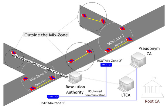 - The secret key of the mix-zones can cause leakage. The ciphertext C contains the encryption key , which must only be used in the specified area. The receiving of this key outside the mix-zone by an external unauthorised vehicle (i.e., the mix-zone is compromised) threatens the security of the communication. Hence, an attacker would be able to communicate maliciously with honest vehicles outside the specified area, which would break the system’s safety.