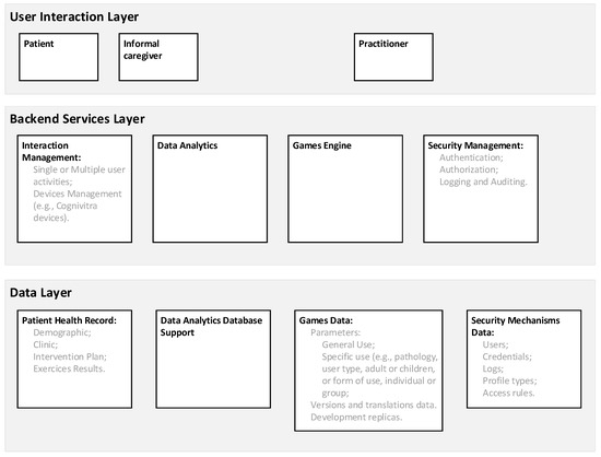 All information collection and communication procedures are processed through the components of the User Application Layer. This layer is understood in a bidirectional sense in terms of information communication and admits specialization according to the characteristics of the users’ profiles and the hardware used for access (e.g., a desktop or a tablet computer). Concerning users’ profiles, beside the patients and the specialized practitioners (e.g., neuropsychologists), other types of users include informal caregivers, physicians, researchers (e.g., data analysts or biostatistics), or those that are responsible for the ecosystem management. The specificities of the various types of users are omitted for clarity.