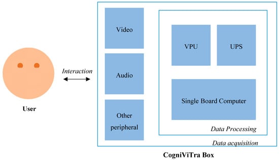 Figure 6 and Figure 7 represent the CogniViTra Box in a higher level of detail, with the components that are encased, specifically the single board computer (SBC) (i.e., Intel/Aaeon Up Squared), the vision processing unit (VPU) (i.e., Intel Movidius Myriad X), the uninterruptible power supply (UPS) and perception devices (i.e., video and audio).