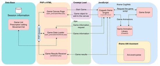 Therefore, as can be seen in Figure 3, the CogniViTra implementation was based on the resources already available in the Platform of Services, including the components of the Backend Services (e.g., the security services, or the Cognitive Games Engine, which is responsible for the management of the various games, as well as the subsequent storage of the patients’ results) and the Data Layer (e.g., patient, game, and security mechanism data). In terms of User Application Layer, the practitioners’ interface is based on the already existing interface.