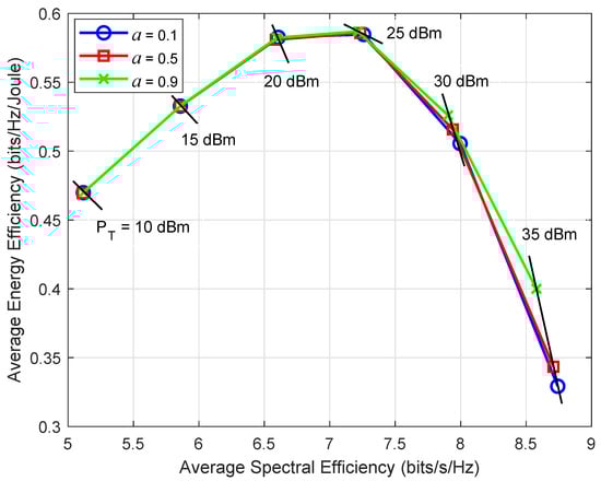 The EE-SE trade-off curves attained by the algorithm framework under different values of BS power constraint and weight a are shown in Figure 3. Obviously, EE-SE trade-offs under different weighting factors are similar to each other when the value of is small, approximately when dBm, as all available power of BS can be fully utilized and both EE and SE are maximized when is small. Therefore, changes in values of a have little impact on the EE-SE trade-off when is small. When gets high, the EE-SE trade-offs under different a differ greatly. It is observed that the increasing of a brings about an increase in EE optimization and a decrease in SE, and the decreasing of a causes a decrease in EE and an increase in SE. That is because larger weight is given to EE for larger a, and thus more focus is transferred to EE when conducting the optimization. However, more focus is transferred to the SE optimization when a smaller weight is given to EE for smaller a.