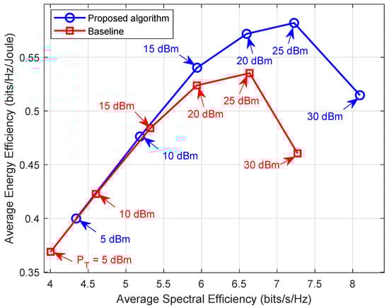 In Figure 4, we show the EE-SE trade-offs of the system under the condition of . In order to illustrate the necessity of jointly optimizing the transmit precoding matrix and the phase shift values for optimizing the system SE and EE, the results of the EE-SE trade-off is provided in a baseline case. In the baseline, the phase shift values at the RIS are given randomly and are not optimized. It can also be observed that under the same transmission power constraint of the BS, the EE and SE results of the joint optimization are greater than those of the baseline, respectively. It indicates that jointly optimizing the transmit precoding matrix and the phase shift values is beneficial for improving the SE and EE of the system.
