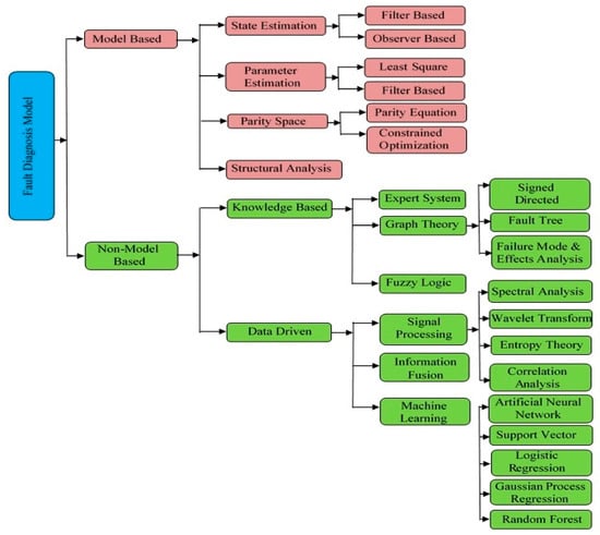 Realizing the importance of fault detection/diagnosis for the safe and reliable operation of LIB, a significant number of research studies were conducted aiming towards developing an accurate, reliable, robust and easy to implement fault diagnostic strategy. Lu et al. [28] briefly illustrated the reason why the development of an effective fault diagnosis system is crucial for the advancement of LIB-powered systems. Special concentration on the sensor fault diagnosis was provided by Xiong et al. [18]. Lyu et al. [29] presented a detailed discussion particularly on the failure mechanism of LIB and its possible solutions through a state-of-the-art review study. Fault diagnosis methods reported in the literature can be broadly categorized into model-based and non-model-based methods. However, a fusion of these two categories is also reported. A detailed classification of LIB fault diagnosis methods is presented in Figure 1.