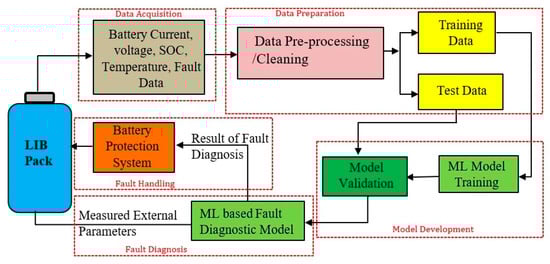 The protection of LIB packs and minimizing the risks associated with the operation of LIB-based systems are indispensable in BMS. Therefore, detection/diagnosis of faults in LIB systems and designing an effective defense mechanism are of utmost importance. Naturally, to establish an appropriate fault diagnostic strategy, in-depth knowledge and understanding of different kinds of faults alongside the corresponding fault mechanism in LIBs are highly essential. Regarding these, Lyu et al. [29] presented a detailed review of failure modes and mechanisms of LIBs and Hu et al. [27] presented a comprehensive review of fault mechanisms, fault features and fault diagnosis of various faults in LIBS, including internal battery faults, sensor faults and actuator faults. A summary of different kinds of external and internal faults in LIBs along with an overview of major fault diagnostic strategies were presented by Tran et al. [19]. Before diving into the details of ML-based fault diagnostic methods reported in the literature, it is worth giving an introduction to the subject matter for the basic understanding of the readers. Therefore, in this section, a generic ML-based fault diagnosis scheme for LIB is presented. Figure 2 depicts the generic block diagram of the ML-based fault diagnosis scheme.