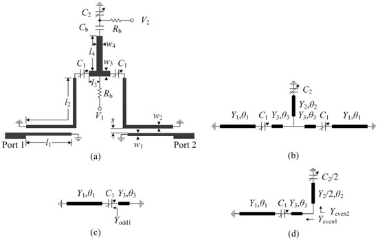 The odd- and even-mode equivalent circuits are illustrated in Figure 1c,d, respectively, the input admittances of the odd- and even- mode can be derived by the following equations: