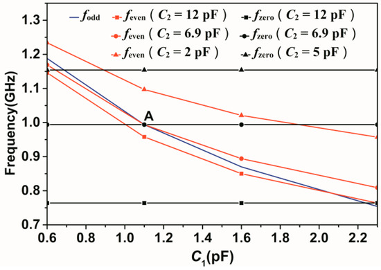 Table 1 shows the tuning ranges of feven and fodd with variation of C1 and C2. fodd is independently decided by C1, but feven is controlled by C1 and C2 simultaneously. With fodd fixed by C1, feven varies around fodd by tuning C2. As shown in Figure 2, by tuning C1 and C2, the specified frequency space between feven and fodd can be obtained. If fodd is fixed by C1, feven can be changed from greater than to less than fodd by adjusting C2, and fzero is changed in the same way. Therefore, there is a C2 such that fodd = feven = fzero for different C1 (fodd), as the point A shown in Figure 2, and the passband can be intrinsically switched off at 0.994 GHz when C1 = 1.1 pF and C2 = 6.9 pF.