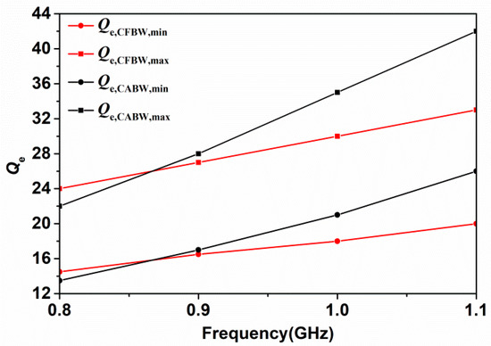 where Qee/eo, fce/co and Δfe/o±90° are the even/odd mode external quality factors, resonant frequencies and bandwidths, respectively. In Figure 4, Qe,CABW,min/max and Qe,CFBW,min/max mean the minimum/maximum curves of Qe to realize 74 MHz CABW and 8.5% CFBW with <12 dB return loss, respectively [26].
