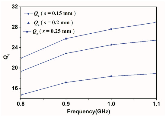 An intrinsically switched tunable filter is designed based on a 0.508 mm thick Rogers RO4350B substrate with a relative dielectric constant of 3.48 and a loss tangent of 0.0037, where the fC is tuned in the range of 0.8–1.1 GHz and the bandwidth satisfies 74 MHz CABW or 8.5% CFBW. The design parameters of the T-shaped resonant are chosen as Y1 = 0.01 S, Y2 = 0.02 S, Y3 = 0.02 S, θ1 = 60°, θ2 = 22° and θ3 = 5° at 1 GHz. By Equations (9) and (10), the filter’s Qe versus fC with different s are extracted in Figure 6, where s is the spacing between resonant and feed line in Figure 1a. It is noteworthy that, with s in range of 0.2–0.25 mm, the values of Qe basically meet the requirements for 74 MHz CABW and 8.5% CFBW shown in Figure 4 at the same time.