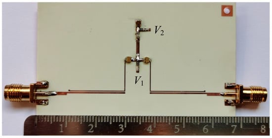 The simulations are conducted by using SONNET software. After optimization, the physical parameters of the filter are determined as in Table 2. The varactors MA46H201 (the capacitance tuning range is about 0.4–2.2 pF) and MA46H204 (the capacitance tuning range is about 1.8–20 pF) from M/A COM are employed as C1 and C2, which are controlled by voltages V1 and V2, respectively. Cb = 30 pF and Rb = 10 kΩ are used as dc block and dc bias, respectively. The photograph of the proposed intrinsically switched tunable filter is displayed in Figure 7. The prototype circuit size of the proposed filter is about 0.31 λg × 0.11 λg, where λg is the guided wavelength at the lowest operating frequency (i.e., 0.8 GHz). The measurements are carried out by the ROHDE&SCHWARZ ZVA24 network analyzer.
