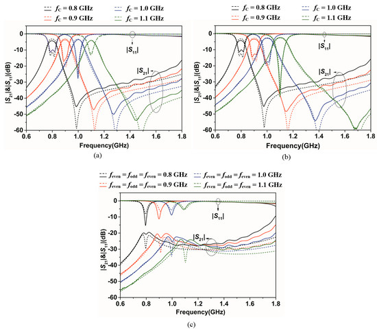 The simulated and measured frequency responses of the proposed prototype with three reconfigurable states are shown in Figure 8. Figure 8a,b depicts the tuning of the center frequency from 0.8–1.1 GHz with 74 MHz CABW and 8.5% CFBW, respectively. It also can be seen that a transmission zero on the upper band edge increases as the center frequency increases in both Figure 8a,b. The measured 3 dB bandwidth of the CABW filter and 3 dB fractional bandwidth of the CFBW filter are 74 ± 1 MHz and 8.5 ± 0.1%, respectively. The measured insertion losses of the CABW filter and the CFBW filter are better than 3.3 dB and 3 dB, respectively, with measured return losses better than 10 dB. Figure 8c presents the responses of passband in intrinsic switch-off state. As shown, the passband can be switched off at 0.8–1.1 GHz by tuning C1 and C2, and the measured isolations are all better than 20 dB. Comparisons with the previously reported switched tunable filter are listed in Table 3. As can be seen, the proposed filer has all the functions of tuning the center frequency, controlling the bandwidth (CABW and CFBW) and switching off the passband, simultaneously. Moreover, it is worth noting that the number of control voltages used in this work is equal to the order of the filter, which can reduce the control complexity of the design.
