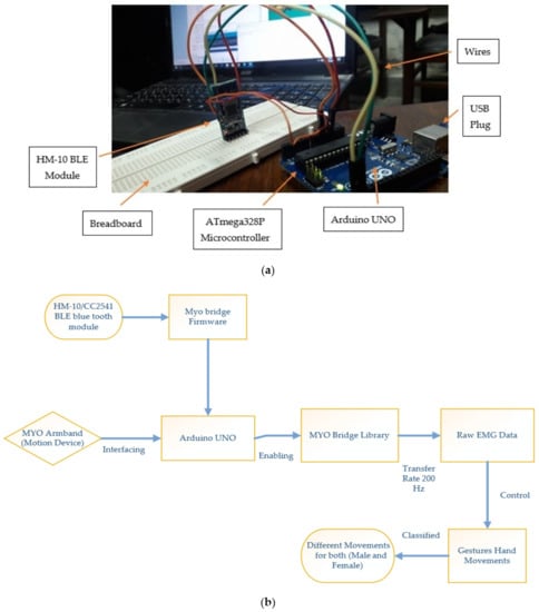 (a) Hardware interfacing of MYO. (b) Measurement system for eight-channel EMG (electromyography) and IMU (inertial measurement unit).