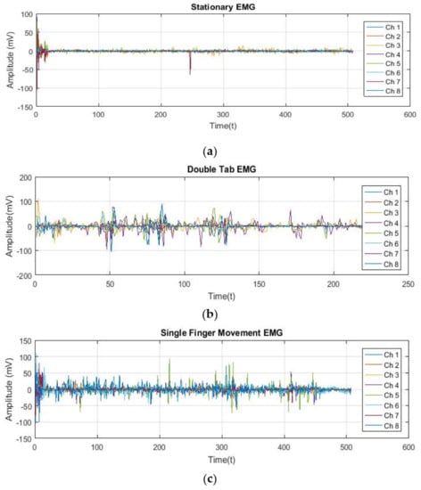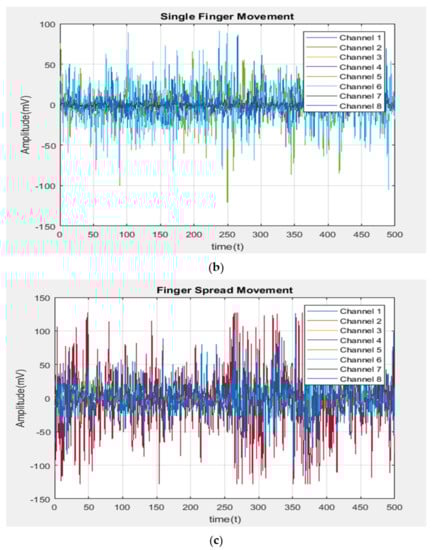 EMG graph of eight-channel MYO armband for female subjects. (a) Stationary EMG signal to double tap EMG signal, (b) single finger movement EMG signal, and (c) finger spread EMG signal.
