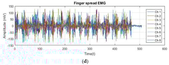 EMG graph of eight-channel MYO armband for male subjects. (a) Stationary EMG signal, (b) double tap EMG signal, (c) single finger movement EMG signal, and (d) finger spread EMG signal.