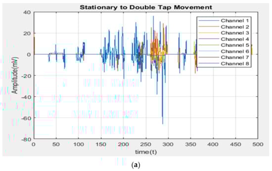 In this experiment, we selected five healthy male and five female subjects of different age groups (25–55 yr) to perform four hand movement gestures such as stationary, double-tap, single finger movement, and finger spread. These four gestures were further used to classify the different hand movements for both males and females separately. The EMG graph of the 8-channel MYO armband for different hand movements of males is shown in Figure 3.