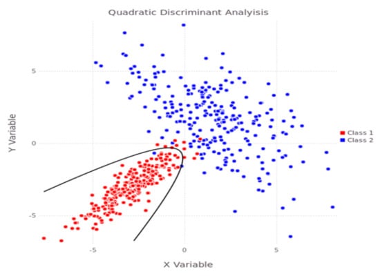 In Figure 6 the discriminant function is basically a second order classifier. The pattern of classification is parallel as well. You just bargain the class k which capitalizes on the quadratic discriminant function. The decision boundaries are quadratic equations in x.