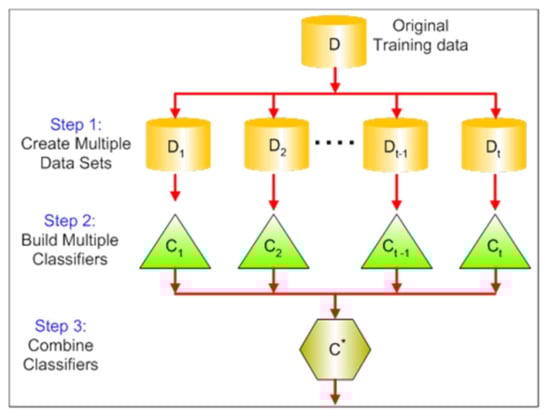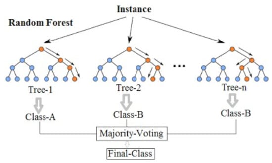 Random forest is the improved version of bagged decision trees. The combined effect of multiple predictions from various models can give a better prediction rate from the uncorrelated sub models or weakly correlated models of prediction. In the decision trees algorithm, a problem arises especially in CART that they are greedy algorithms, so they pick a variable to split through the greedy algorithm to minimize the error. There are a lot of similarities in pattern and design configuration for decision trees in case of a bagged tree and they have a high correlation in their prediction level. While in the case of the random forest shown in Figure 10, they changed the algorithms as sub-trees learned in their training process, so their resulting predictions have less correlation among these sub-tresses. The algorithm used for training in the case of random forest applies the same approach as used by bagging or bootstrap aggregation trees to learn. If the data set is given as: