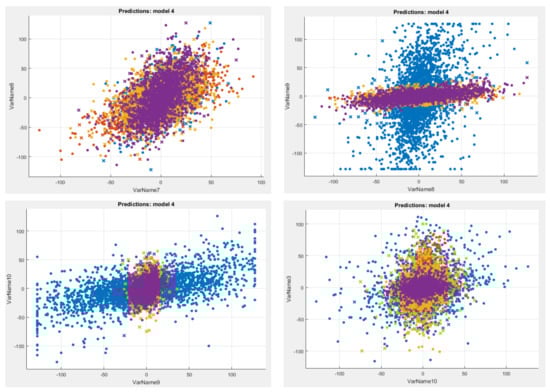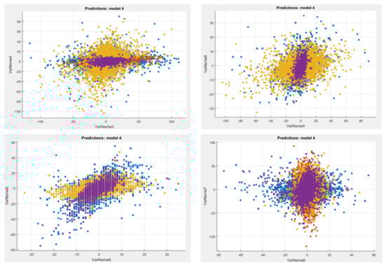 To employ the classification approach, we used the 5-fold cross-validation technique in our model of classify learner with four classes of EMG data. In the case of WEKA, 10-fold cross-validation approaches are used to classify our EMG data as shown in Figure 12. The scatter plot of four classes of EMG signals in classify learner is shown in Figure 13 and Figure 14 where we can see the scatter plot of EMG data among each channel of MYO (as column 1 = channel 1, column 2 = channel 2, and so on) for both cases of male and female (As VarName 3 = channel 1, VarName 4 = channel 2, and so on). In our model of classify learner, we defined a response variable to classify the predictive behavior of four classes of EMG signal. For this reason, we marked our four-class hand gestures as 0 for stationary, 1 for double tap, 2 for movement of single finger and 3 for finger spread as response variable as shown in Table 1.