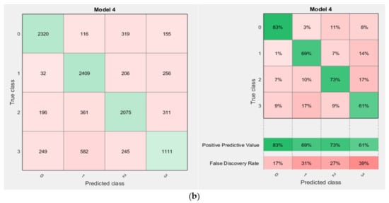 Confusion matrices of four-class hand gesture for females. (a) For males; (b) for females.