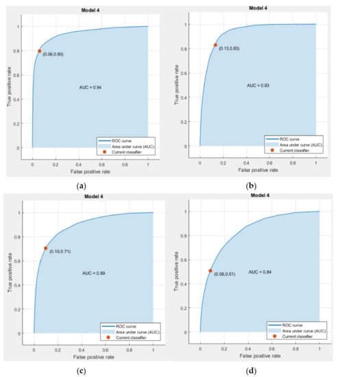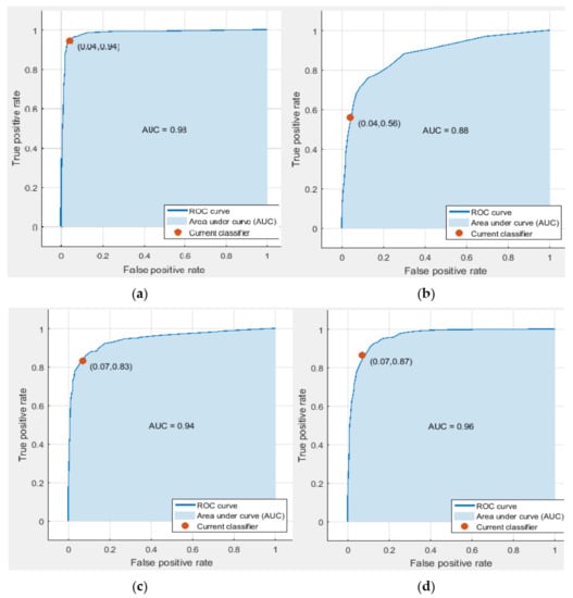 ROC curve of four classes of EMG data (for males): (a) stationary, (b) double tap hand gesture, (c) single finger movement, and (d) finger spread hand gesture.