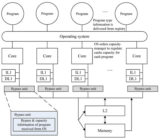Proposed cache architecture. Bypass units have information about required cache capacity for each program, which is delivered from operating system.