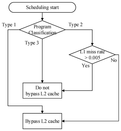Conventional scheduling in multicore systems allocates all programs into the L2 cache, which is, however, not always optimal, especially in mobile systems. We can utilize bypassing for better performance. When there are scheduling requests for type 3 and type 1 (or 2) programs, type 1 program can bypass the L2 cache to increase overall performance because type 1 program will not disturb the cache blocks of type 3 program. Type 3 program is sensitive to L2 cache capacity, so conflicts by the type 1 program can affect its performance largely. We developed a few rules about bypassing the L2 cache based on our extensive experiments. The first one is that type 3 programs do not bypass the L2 cache because these programs require large L2 cache capacity. The second one is that type 1 programs bypass the L2 cache because this type of programs shows little performance degradation due to bypassing and because other programs will have benefits by the bypassing. Finally, type 2 programs do not bypass the L2 cache if the result of multiplication of L1 data cache miss rate by the ratio of data requests per instruction is larger than 0.005. Otherwise, they bypass the L2 cache. Programs whose IPC are low typically show high data requests ratio. However, if their locality is high, high data requests ratio will not cause noticeable performance degradation. Thus, we take into account both data requests ratio per instruction and L1 data cache miss rate. This value represents memory intensiveness of the program. By various experiments, we get value 0.005 to separate type 2 programs. This scheduling algorithm is described as a flowchart in Figure 3.