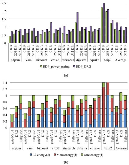 We also measured the execution times and EDPs (Energy-delay product) for each configuration of more benchmarks. Figure 4a shows EDPs with power-gating and EDPs with the DRG-cache scheme supporting data retention. Figure 4b shows normalized energy consumption breakdowns and execution time of the optimal L2 cache configuration for each benchmark. The reason why we do not show execution time results of the DRG-cache scheme is because it shows similar behavior to power-gating. All values are normalized to the results of the 1024 configuration. The first three benchmarks show similar execution times among the four configurations. EDPs of these benchmarks show gradual increase with increasing L2 cache size. These benchmarks are classified as type 1, where L2 cache bypassing is able to reduce EDP. The total energy reduction with L2 cache bypassing and power-gating for these benchmarks is 57.2% on average. With DRG-cache, the average total energy reduction is 24.9%. The crc32, stringsearch, dijkstra, and equake benchmarks show similar execution times among the 256 KB, 512 KB, and 1024 KB configurations but bypassing shows large execution time increase. These benchmarks are classified as type 2, where the 256 KB configuration shows good results. Energy reduction is 35.4% with power-gating and 10.4% with DRG-cache on average. The bzip2 benchmark shows gradual decrease of execution time with increasing L2 cache capacity. The differences of execution times among the four configurations are large. Reducing L2 cache capacity directly degrades its performance. EDP increases as L2 cache capacity decreases because of increasing execution time although L2 cache leakage power decreases. In terms of execution time and EDP, the 1024 KB configuration is the optimal configuration for this benchmark. Overall, EDPs with power-gating and DRG-cache show similar behavior.