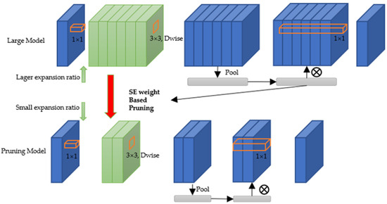 In this context, we thought of the LBC network [41]. LBC is an application based on local binary pattern (LBP) [42] features in traditional machine learning and uses a non-trainable convolution kernel with only three values of −1, 0, and 1. The convolution kernel of LBC is binarized and has advantages over traditional convolution kernels in terms of calculation speed and storage space. In the case of the same convolution kernel size, the non-trainable convolution kernel parameters reduce the overall training difficulty of the model. However, because the LBC kernel is not trainable, the model result has a great correlation with the number of kernels. As the effect of LBC has a strong positive correlation with the number of LBC kernels, many randomly generated LBC kernels must be redundant. This assumption is in line with the theory of model pruning. Model pruning based on LBC not only needs to find the model structure after pruning, but it is more important to find the non-trainable LBC kernel parameters. In our work, we did not use the existing structured model pruning scoring method, but used the weight of the data-driven SE block as the evaluation of the channel. At the same time, a depthwise convolution layer structure is introduced, so that the LBC kernel corresponds to the SE optimization weight. Compared with the evaluation function of the existing model pruning method, the squeeze-and-excitation (SE) optimization [37] weight is obtained through training, and the relationship with the convolution channel is more intuitive.