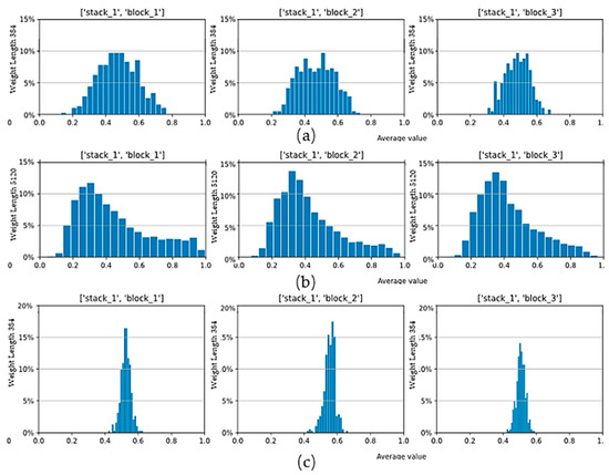 The statistics of SE optimization weights of the training set on the CIFAR-10 database. (a) The model with the expansion ratio r = 6, random initialization; (b) the model with r = 80, random initialization; (c) the model with r = 6, pruning and retraining from the model r = 80. Each subfigure represents the three blocks in stack 1 of each model.