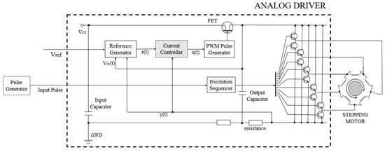 The ADB-5410 driver is commercially available and mainly consists of an excitation sequencer, a reference generator, and a current controller. The excitation sequencer determines the rotation angle and angular velocity of the motor by distributing the currents flowing to the coils, which is used to rotate the motor, in response to the input pulses. The reference generator compensates for the effect of the back EMF caused by the rotational speed and is designed to reduce the unevenness in torque. It is also composed of analog elements inside the ADB-5410.