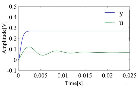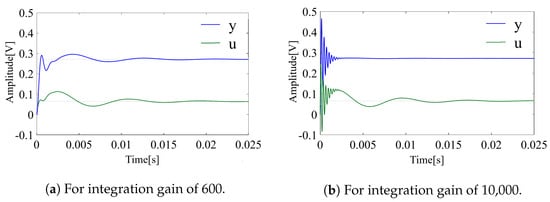 The analog control system for the motor current in the driver ADB-5410 is shown in Figure 3. A digitalization of this analog controller is described in Section 3.4. An integrator in this current control system is designed to remove the deviation between the steady-state of the output voltage and the reference voltage . In the conventional analog driver, the acceleration performance and the speed fluctuation suppression performance are tuned by adjusting the gain of the integrator via a capacitor within the range of 600–10,000 physically. Figure 4a,b shows the step responses of plant input u and the output voltage y with the integrator gain of 600 and 10,000, respectively. It can be seen that achieving high performance for both acceleration and speed fluctuation suppression characteristics simultaneously is a challenge and is a trade-off of the analog controller.